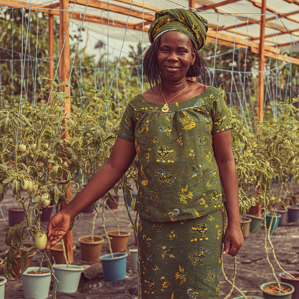 In einem Gewächshaus auf einer Kakaoplantage in der Nähe von San Pédro an der Elfenbeinküste bauen eine Gruppe von lokalen Frauen Gemüse und Obst an. Es ist in dieser Region aufgrund der Bodenbeschaffenheit, des Wassermangels und der Hitze nicht möglich, Gemüse und Obst anzubauen. Aber mit unserem Gewächshaus, dem richtigen Boden und der Wasserversorgung haben wir zu einer nahrhaften Zukunft für unsere Kakaobauern und ihre Familien beigetragen.