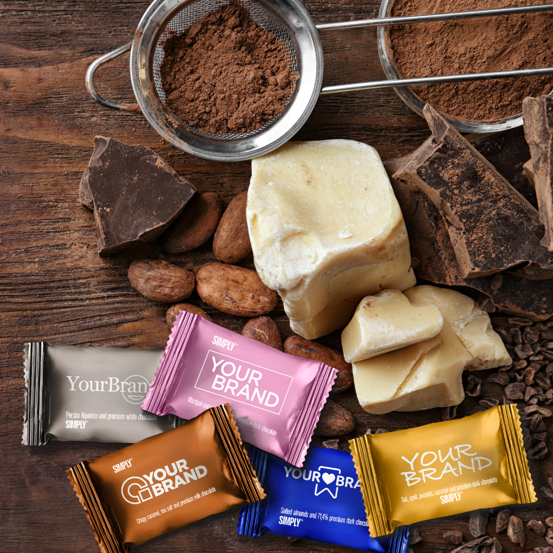 Ihr Logo auf unserer Premium-Schokolade? Gestalten Sie Ihre ganz eigene Schokolade mit genau Ihren Markenfarben, Ihrem Logo und Ihren Statements. Wir maßschneidern die perfekte Lösung für Sie. Registrieren Sie sich als Geschäftskunde und erfahren Sie mehr.