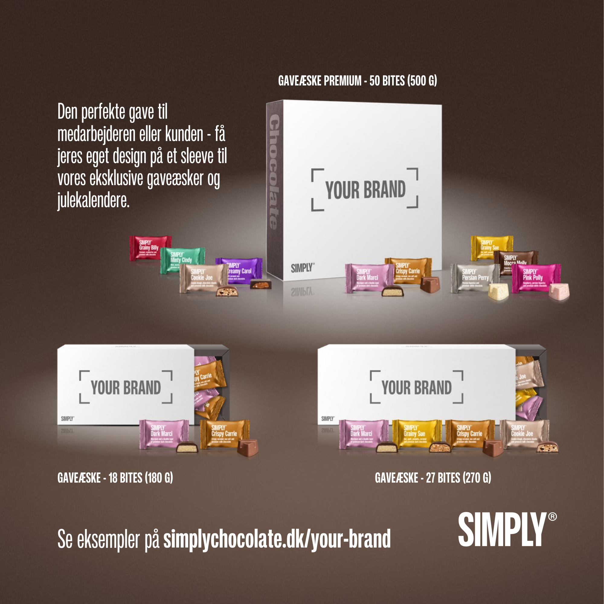 Om det er bites til mødelokalet eller gaveæsker med jeres eget logo på, så tøv ikke med at kontakte os!