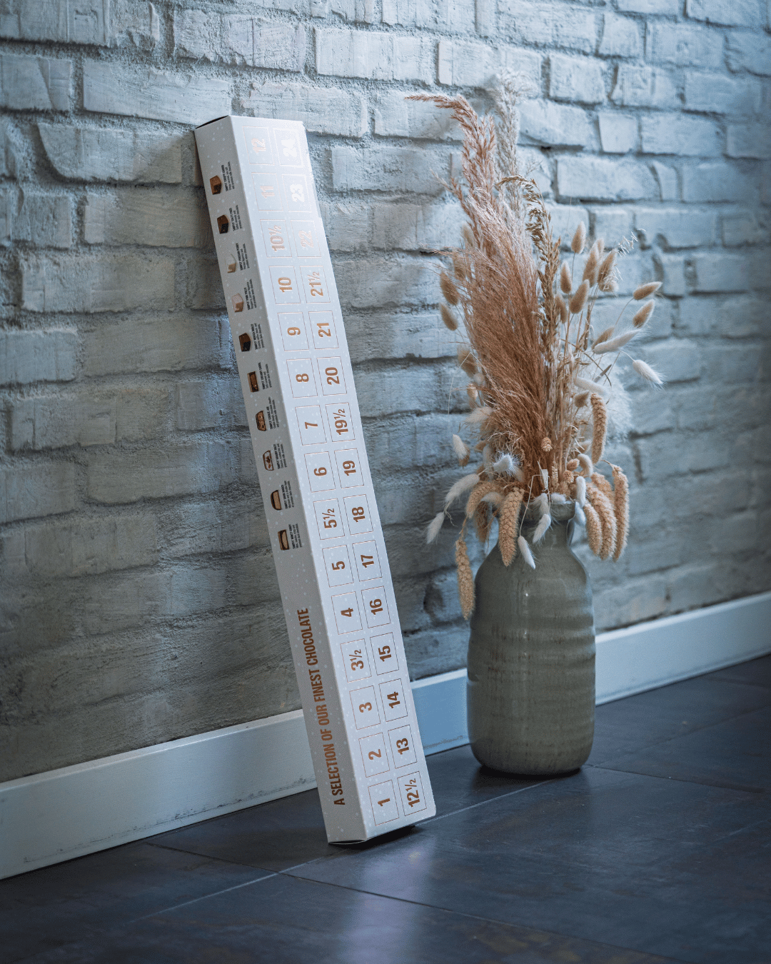 Tre af dem er fyldt med vores prisvindende premium chokolade i smagskombinationer som karamelcrunch, saltede mandler, persisk lakrids, marcipan, mint og cookie dough, alt sammen skabt på vores danske chokoladefabrik. Er én chokolade om dagen ikke nok, kan du vælge Simply® For Sharing med to stykker bag hver låge.